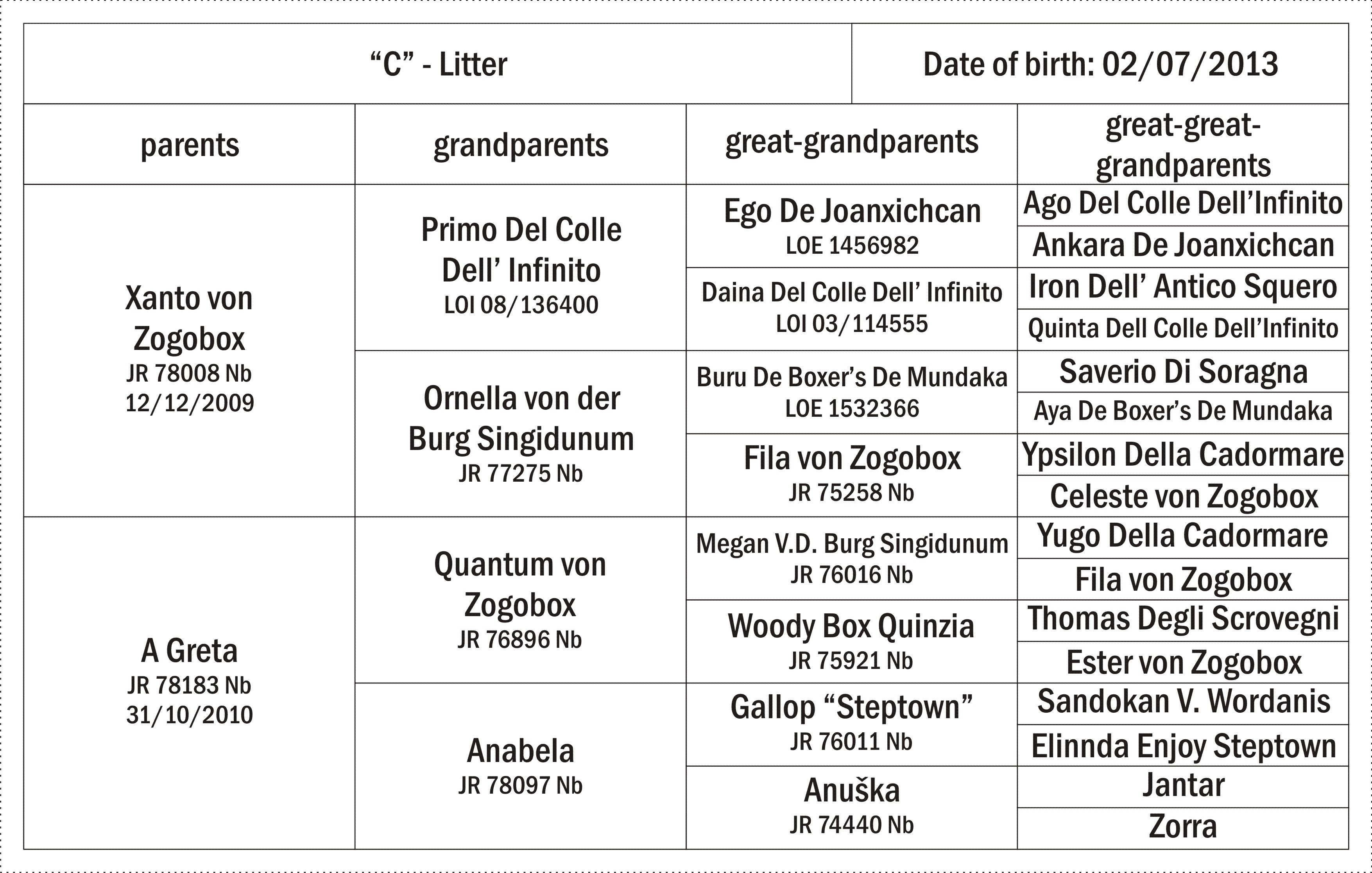 “C” litter is like a breeders dream. The mating combination of Xanto von Zogobox and A Greta brought us six fawn, healthy, uniform puppies, four males and two females; we chose to keep Cicciolina von Galovica, she is a great hope of our breeding program.